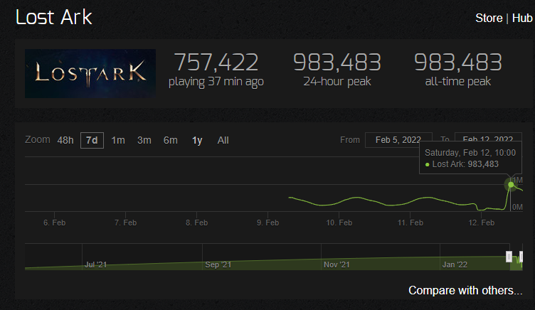 스팀판 로스트 아크가 동시 접속자 98만을 돌파했습니다.