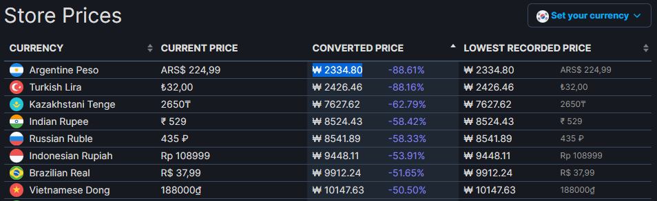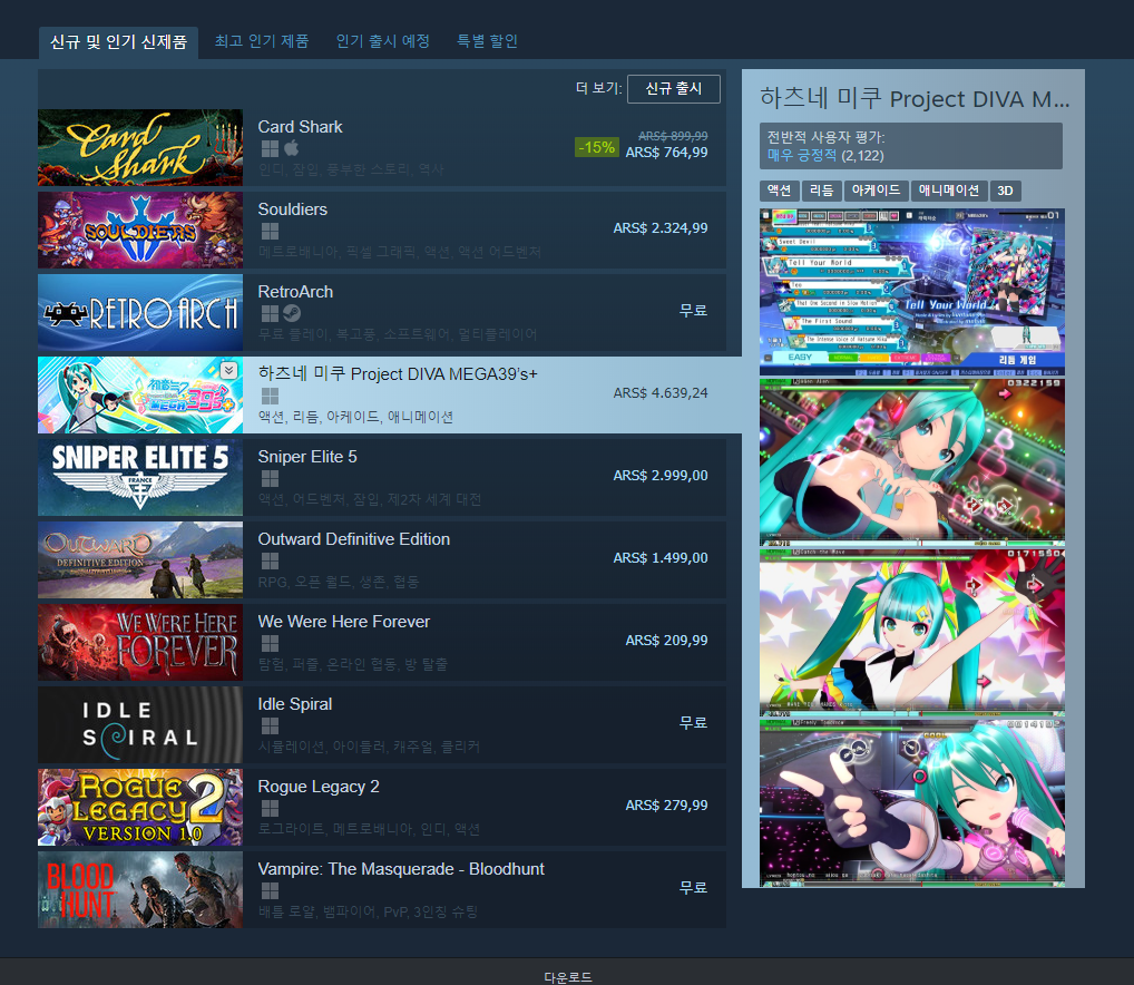 https://amila.tistory.com/298 스팀 해외계정 아르헨티나 계정 만들기 우회구매 하는 방법 재생 https://steamdb.info/app/1604030/ 해외 시세는 이 곳에서 확인 할 수 있습니다. 현재 인기 몰이를 하고 있는 신작