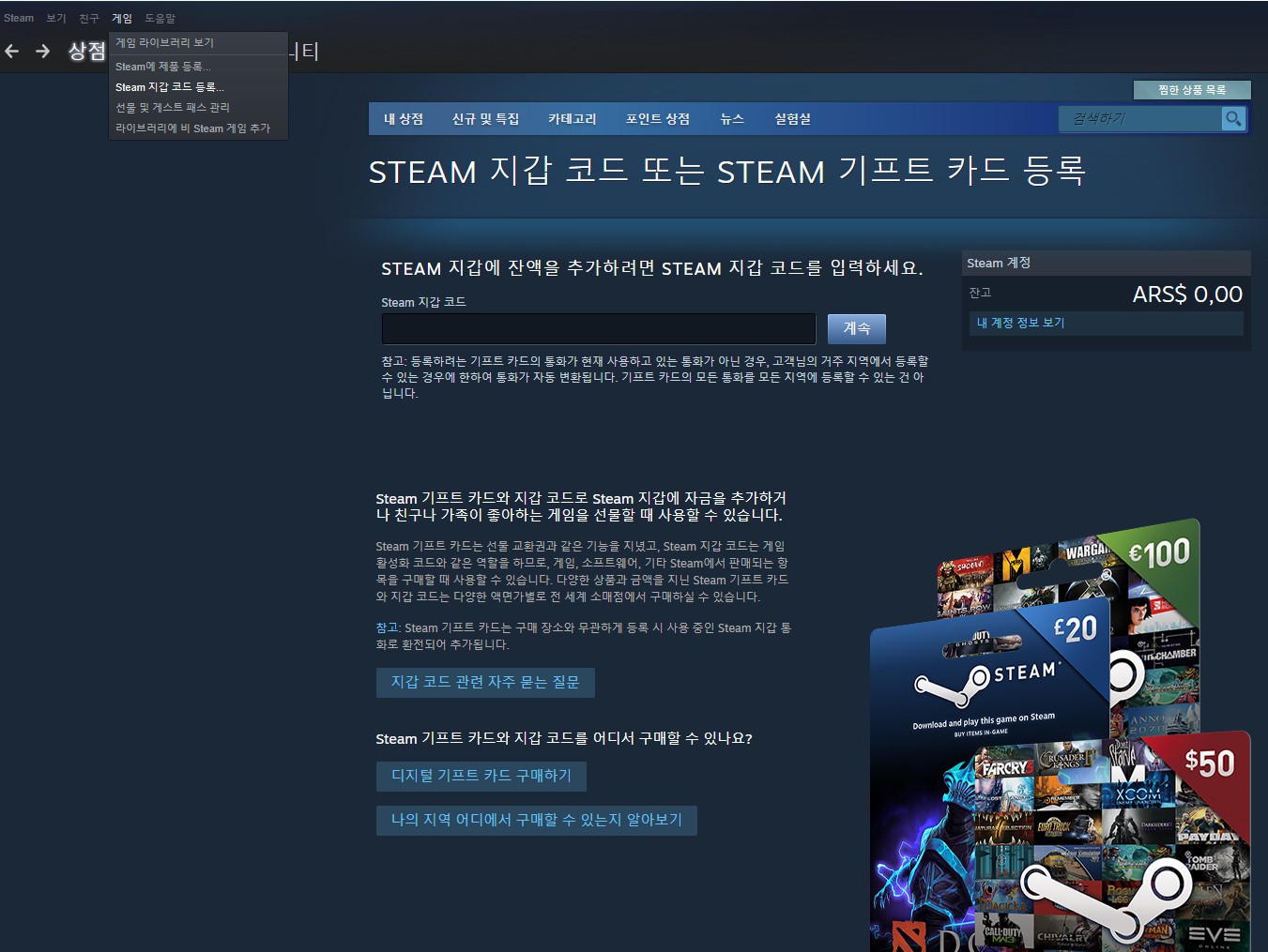 스팀 월렛코드 아르헨티나 페소 ARS 200, 300 구매