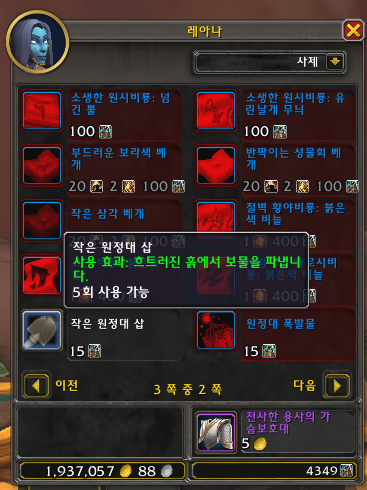 깨어나는 해안 용비늘 기지에 레아나라는 NPC가 판매하는 작은 원정대 삽으로